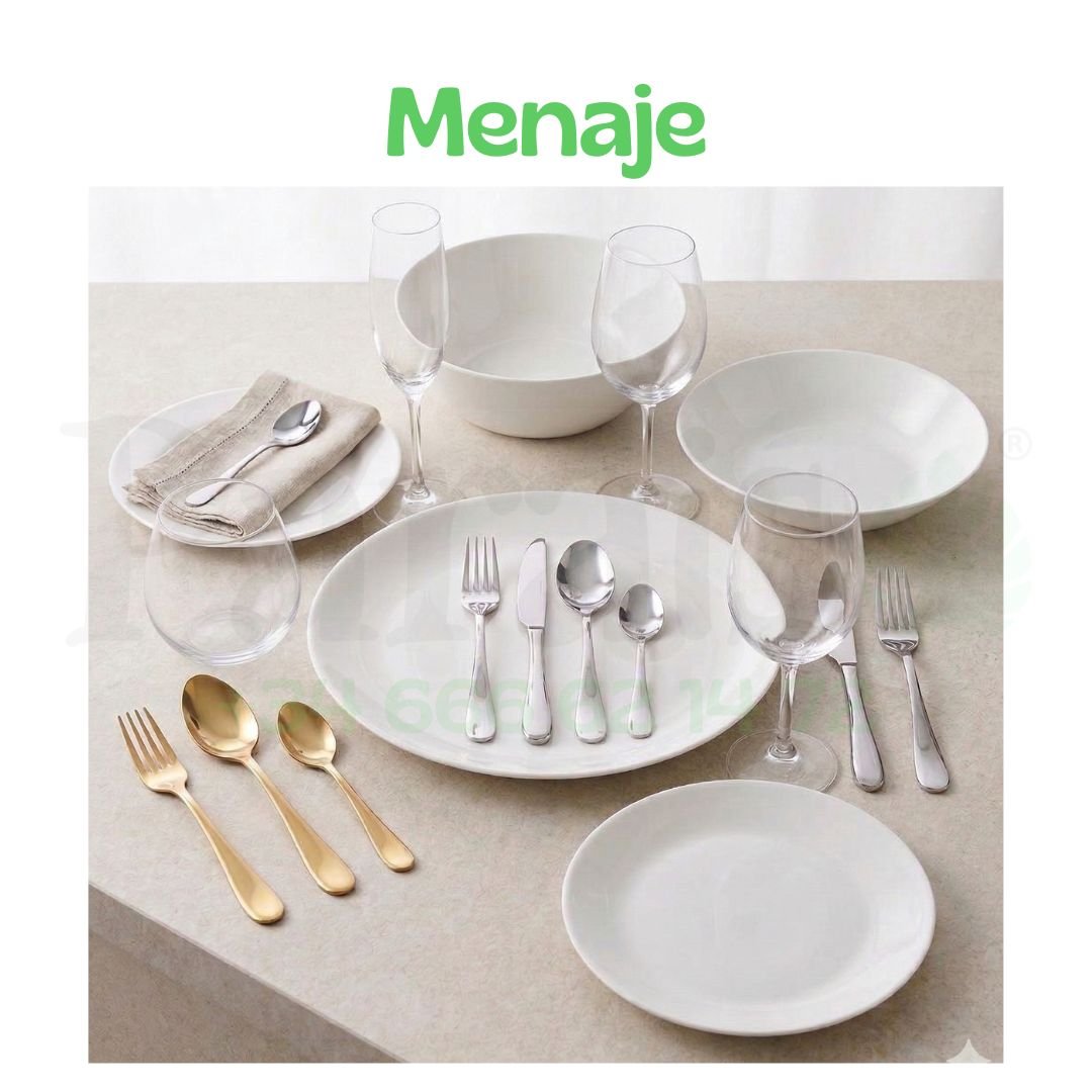 Vajilla, cristalería y cubertería que realzan tu mesa, se entrega limpio y desinfectado, listo para la mesa.