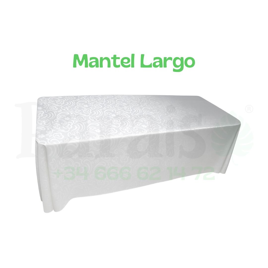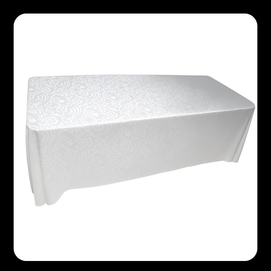 Alquiler Mantel Tela Blanca con Arabescos, sus medidas son 3,80 mt*2,60 mt.