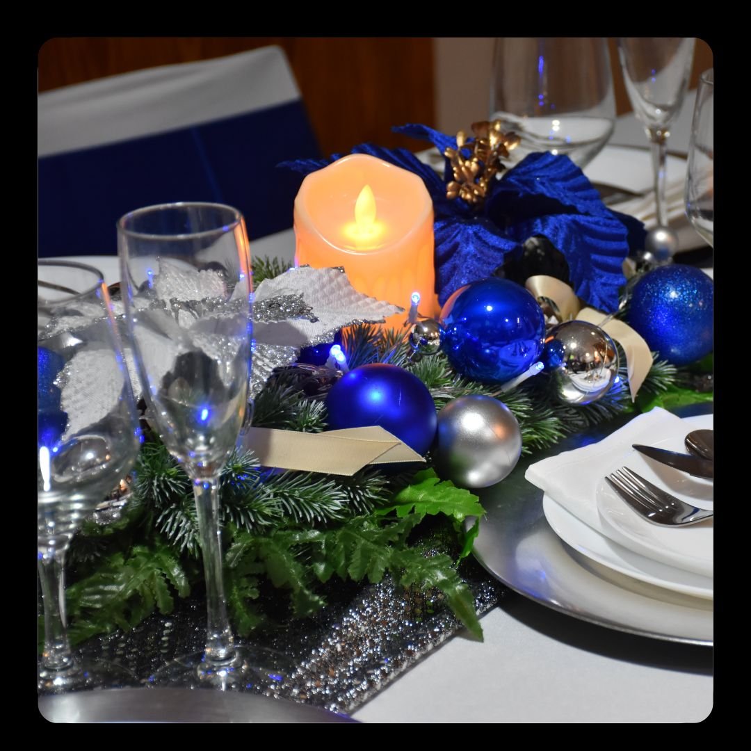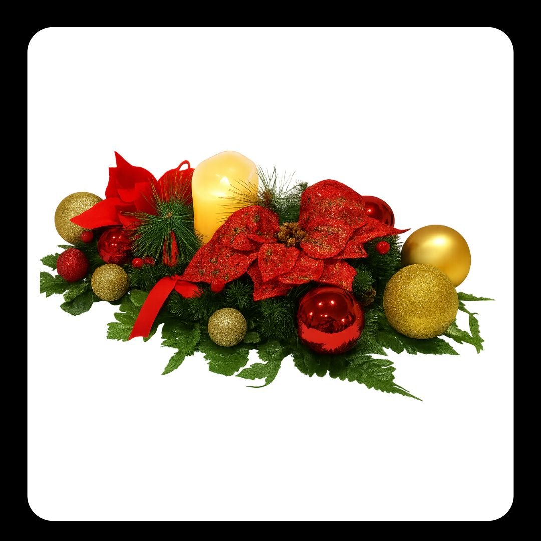 Incluye: vela LED, lazo rojo navideño, bolas doradas y rojas, follaje verde.